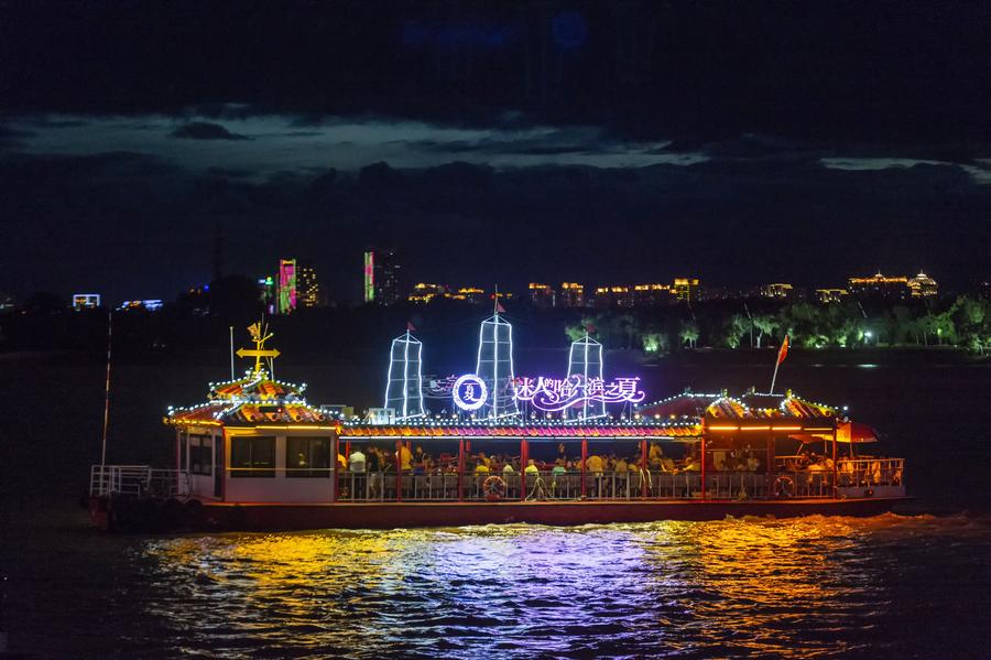 turistas divirtiéndose en un barco en el río Songhua(220715) — HARBIN, 15 julio, 2022 (Xinhua) — Imagen del 14 de julio de 2022 de turistas divirtiéndose en un barco en el río Songhua, en Harbin, en la provincia de Heilongjiang, en el noreste de China. (Xinhua/Xie Jianfei) (da) (vf)